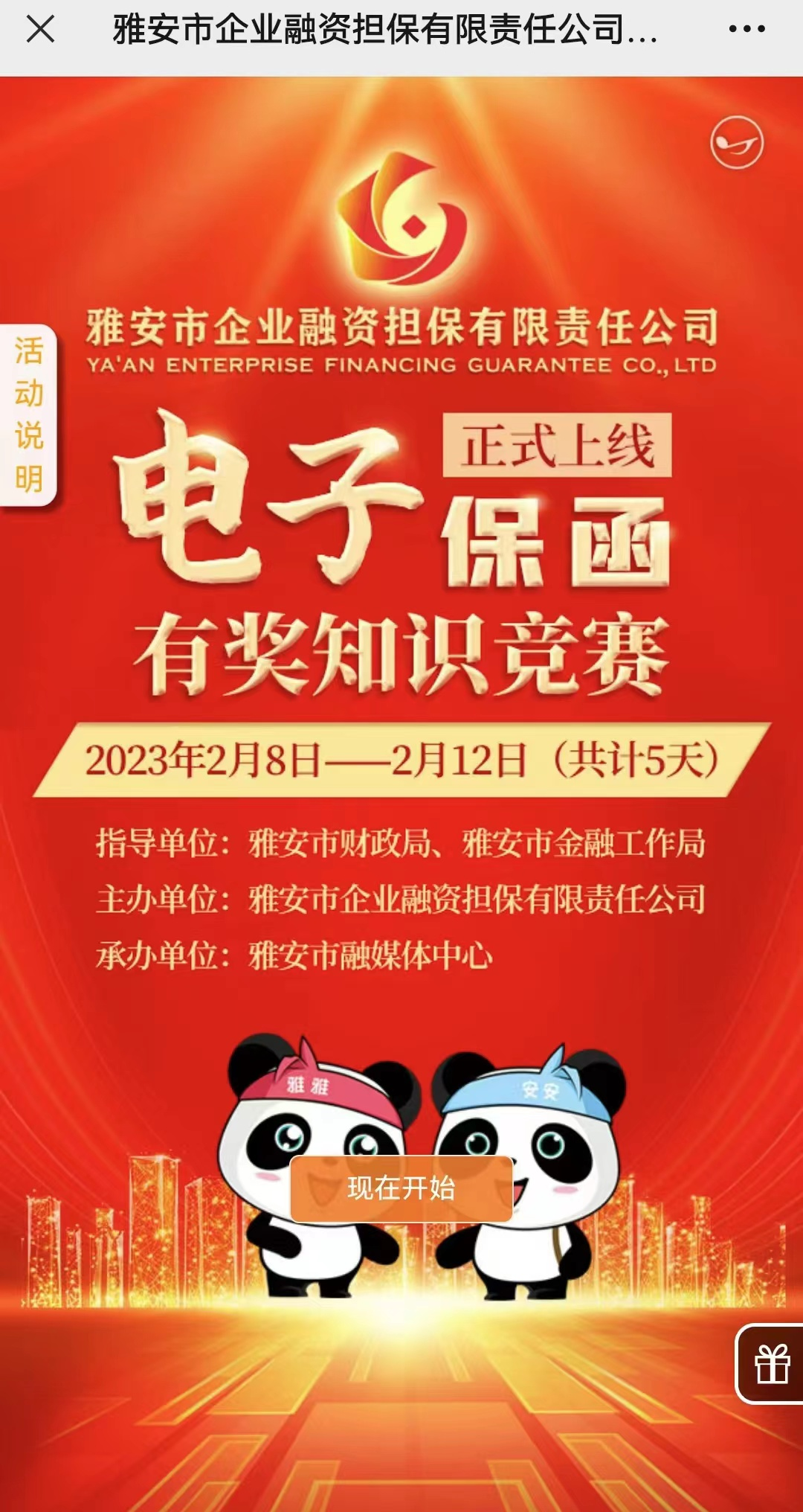 該活動由市財政局和市金融工作局指導,雅安市企業(yè)融資擔保有限責任公司(以下簡稱“市擔保公司”)主辦,雅安市融媒體中心承辦。市擔保公司作為我市唯一一家政府性融資擔保機構(gòu),也是雅安公共資源交易中心上線的唯一一家本地全類別保函服務商。2月6日,市擔保公司“電子投標保函”業(yè)務在雅安公共資源交易中心正式上線。為讓更多的受眾了解“電子投標保函”業(yè)務,市擔保公司主辦了此次線上有獎知識競賽活動。